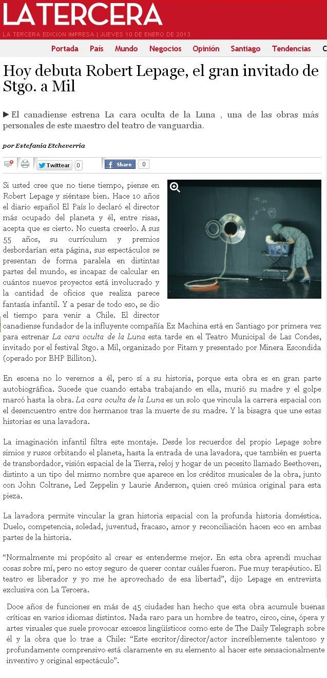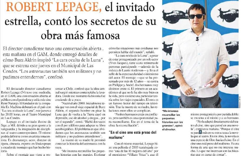 Del la mano del galardonado director canadiense Robert Lepage, se presentó en Chile su gran producción épica sobre un hombre que intenta lidiar con la muerte de su madre y el distanciamiento de su hermano.