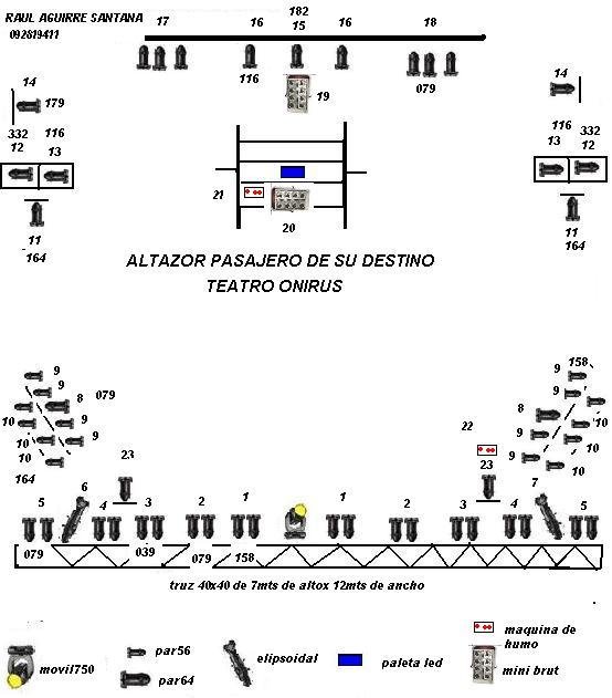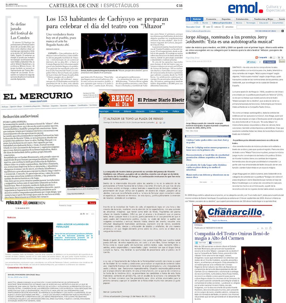 “ALTAZOR, pasajero de su destino”, (Altazor, passenger of its fate) of Teatroonirus Company, directed by Horacio Videla Montero, is a mixture of several theatrical techniques for a major stage poem to have a meaningful impact on large audiences, (2000 to 3000 viewers) inspired in Altazor , the poem of seven songs by Vicente Huidobro.