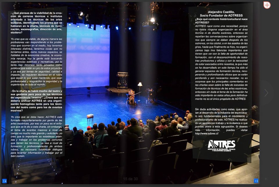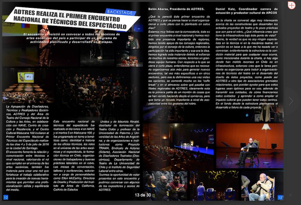 In 2016, ADTRES, the Association of Performing Arts Designers, Technicians & Scenic Carpenters organized the First National Encounter of Spectacle Technicians, aimed at promoting the relationship and communication between technicians at a national level, putting in value the role they play in the universe of Performing Arts, as well as create a network that strengthens the collaborative work for the creation of new tools that allow a solid and balanced professionalization of the environment.