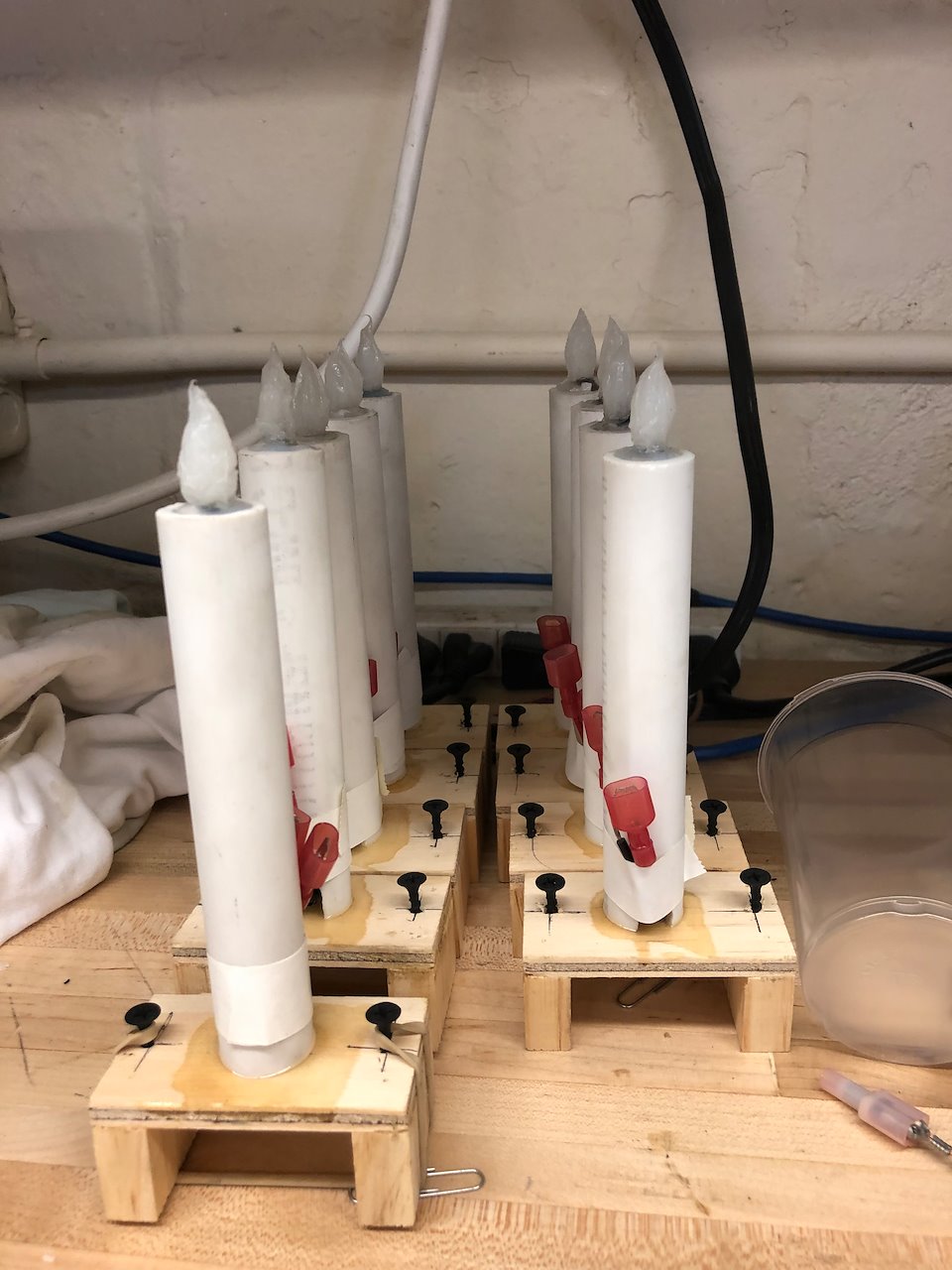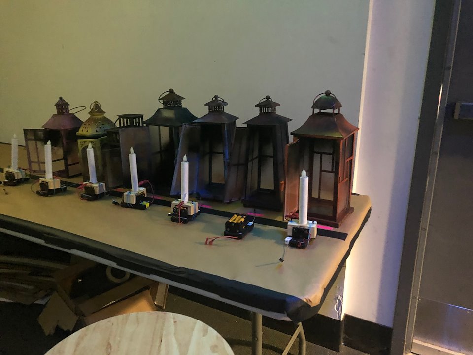 As the Master Electrician of this “post-electric show,” I was challenged to develop a series of practicals that could imitate the lighting properties of a live flame. Most of these practicals (electric props) required wireless DMX control and were powered by different types of batteries.