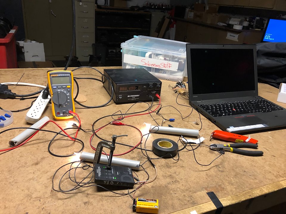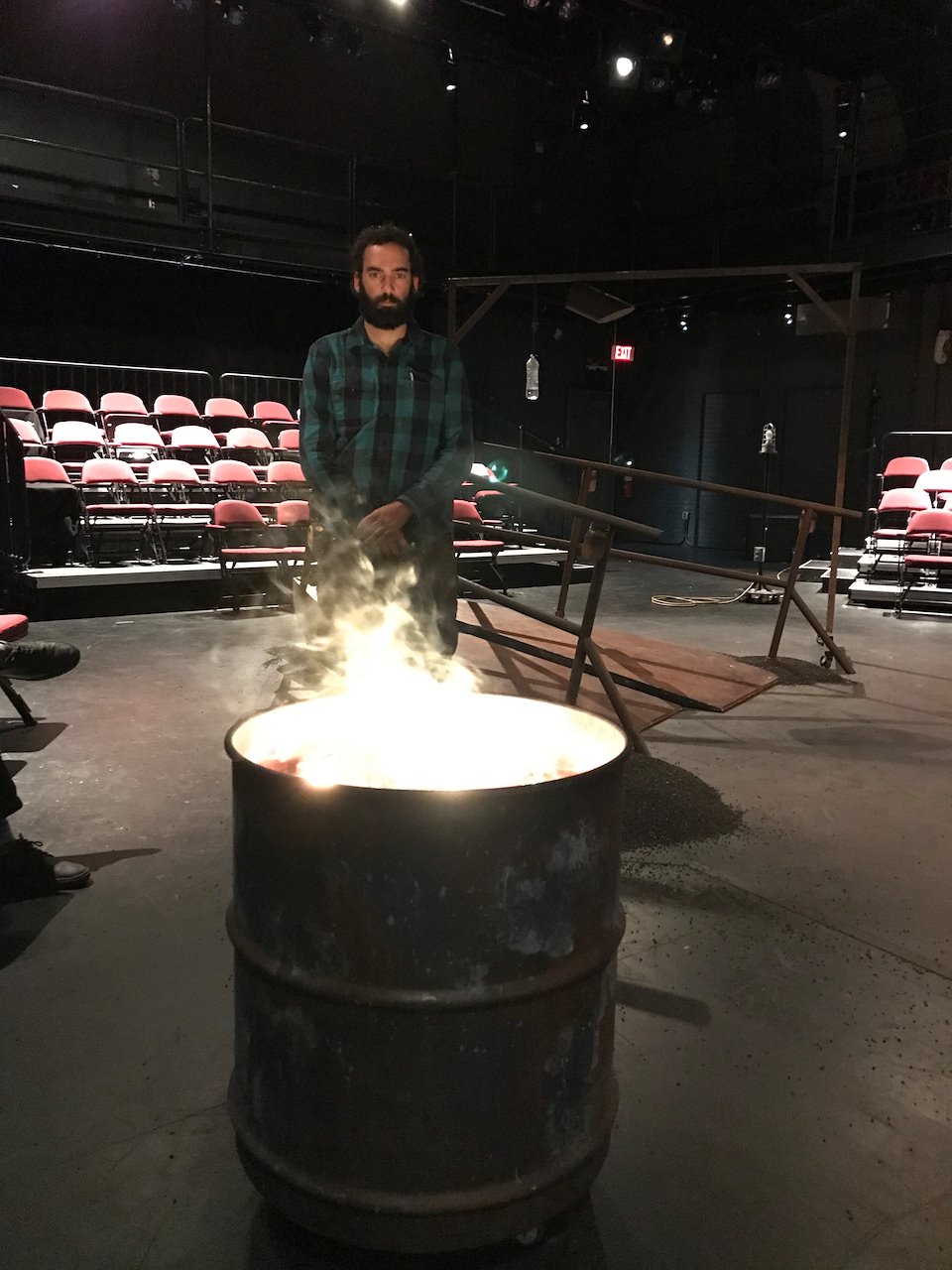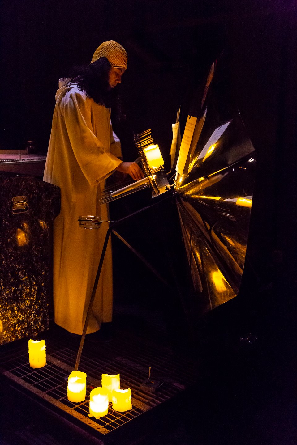 Como jefe de iluminación de este espectáculo tuve el desafío de desarrollar objetos de utilería que pudiesen imitar las propiedades lumínicas de una llama de fuego. La mayor parte de esos elementos requerían control inalámbrico DMX y baterías.